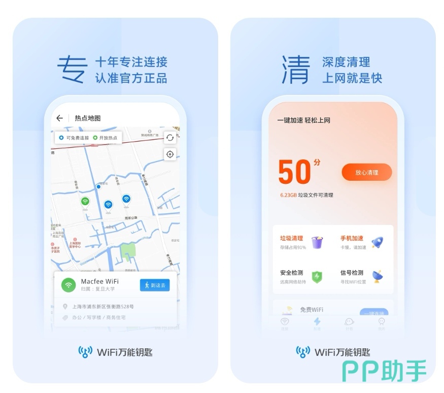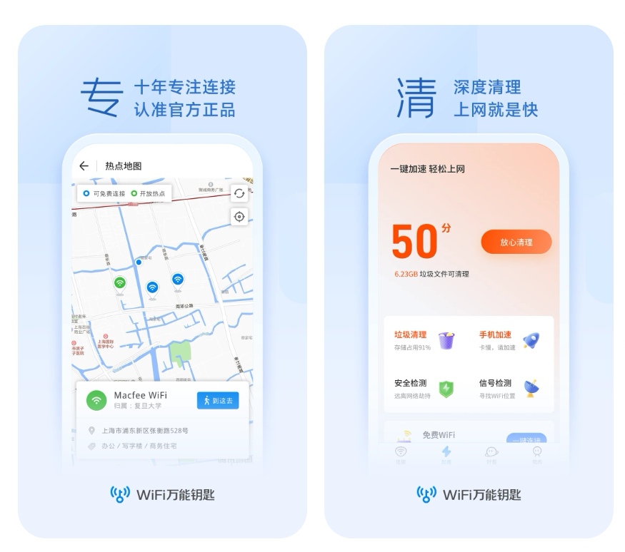 可以说它是WIFI钥匙类软件的鼻祖了,一亿多的下载量可以让大家在吃饭和逛街的时候随心连,不管是酒店、机场还是景区等等,都可以连接到网络,上网也是安全有保障的,三重防护贯穿始终,一键智能连接的操作更加简单,已经覆盖了200多个城市,一键查询就可以快速识别到非常多的WIFI,可以用万能钥匙打开的也会有小钥匙的提示。