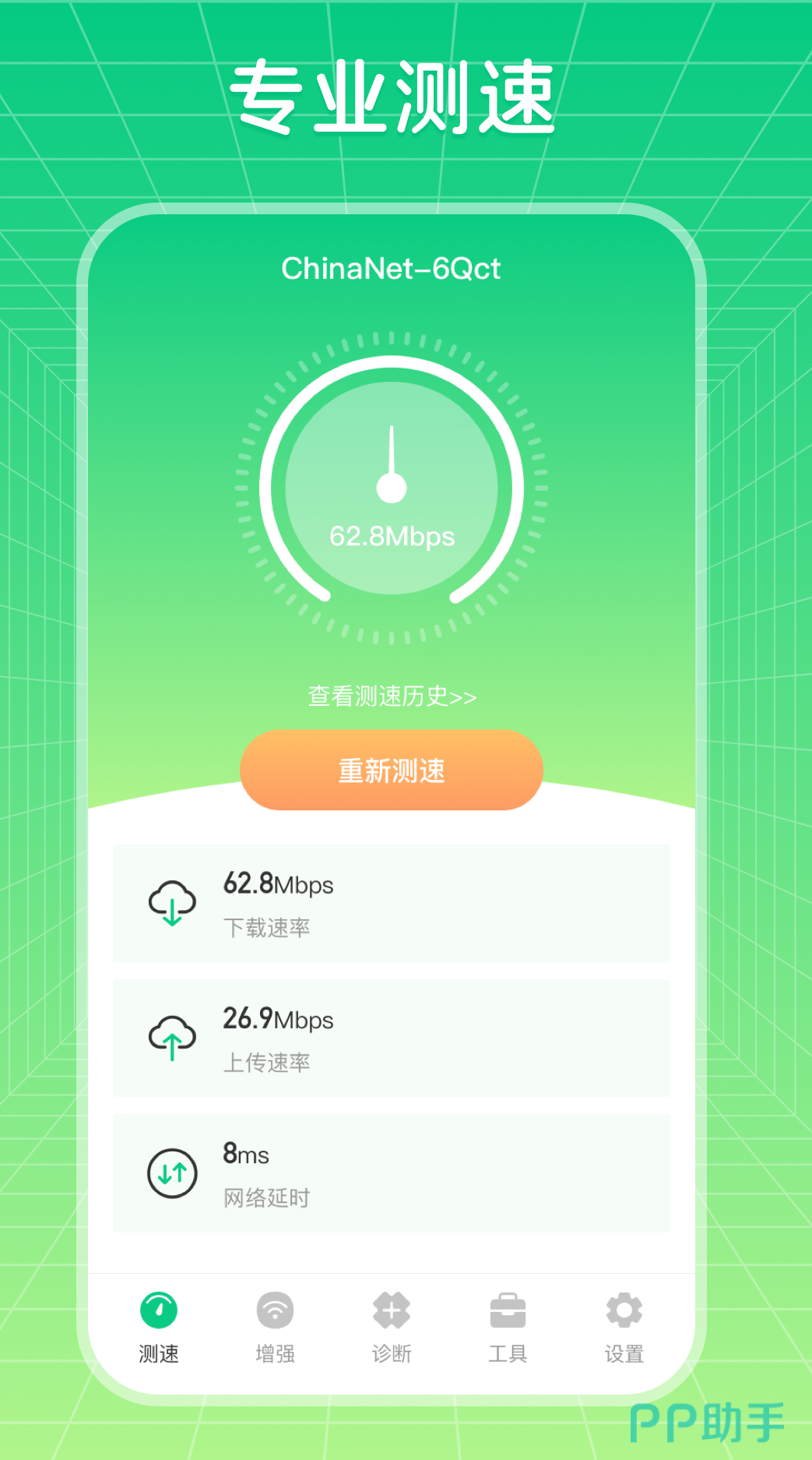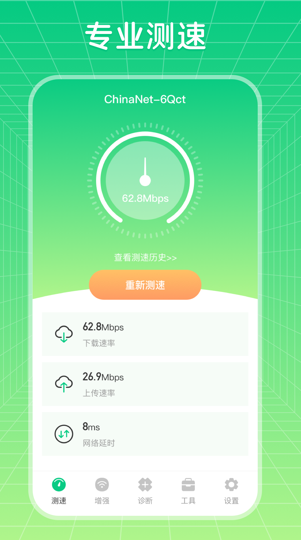 可以对网络进行测试的软件,点击按钮给手机进行一键加速,以无线测速为主,把更准确的网络信息提供给用户,像手机运营商的3g、4g、5g网络也是可以进行测速的,对于WIFI信号的强度你也可以一目了然的看到。