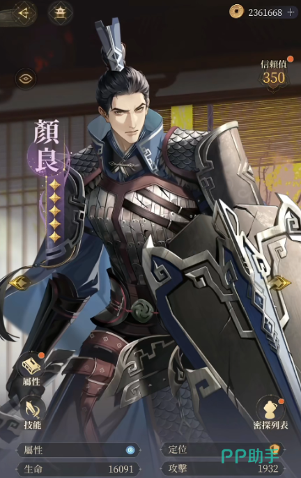 他的大招“身先士卒”是一个单体嘲讽技能,使用后不仅能让单体敌人只攻击自己,还能为全体队友提供相当于颜良42.5%最大生命值的护盾。考虑到颜良本身是一个肉盾,这个护盾的厚度是相当可观的,并且作用范围是全体队友,这使得其他敌人难以对友军造成伤害。