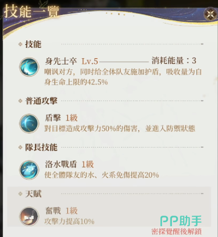担任队长时,颜良的保护能力将得到进一步提升。此时,新增的“洛水战盾”能使全体队友的水系和火系减伤提高20%。游戏中这种类型的攻击比较常见,因此这个加成可以使颜良的队友变得更加坚韧。