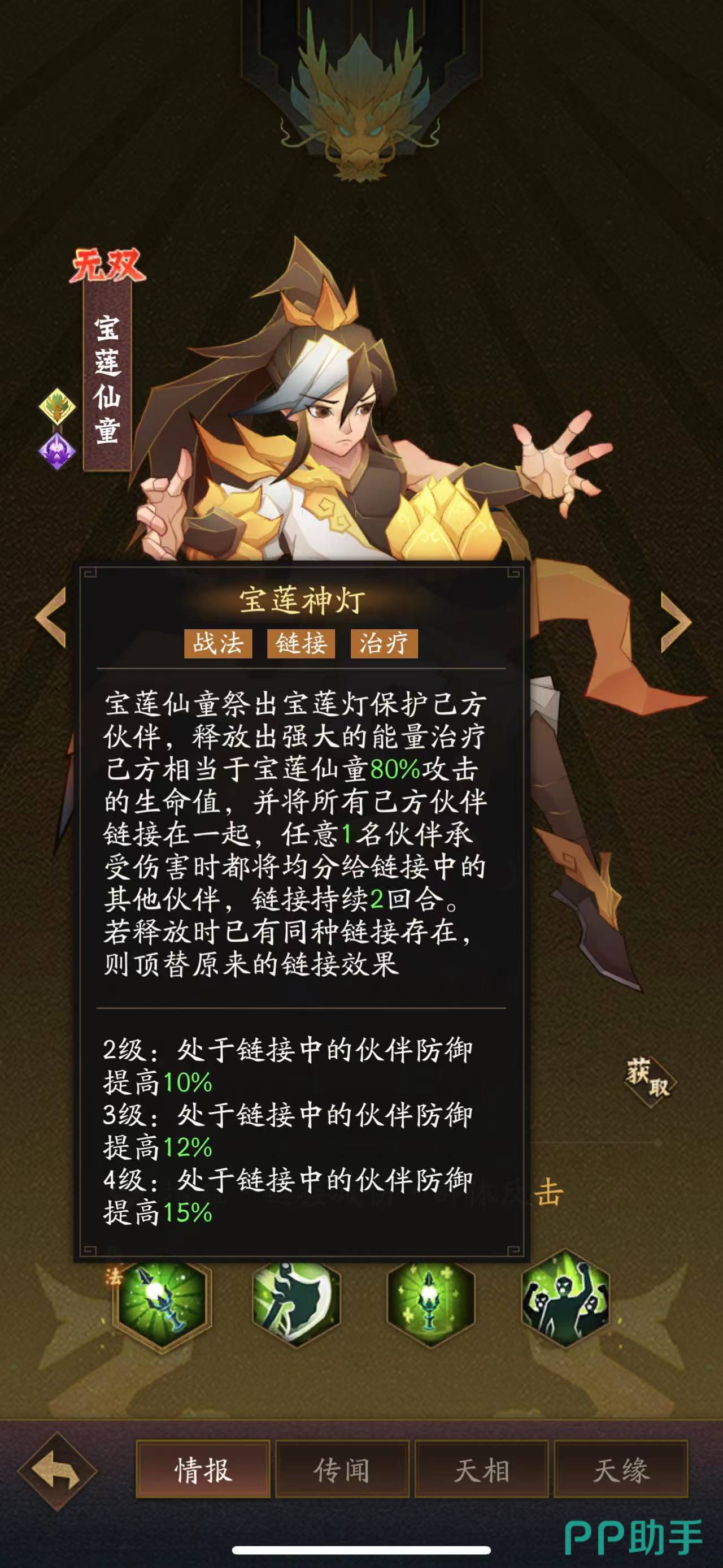 第三个角色宝莲仙童,属于一个治疗辅助角色,技能叫宝莲神灯,宝莲仙童会祭出宝莲灯保护全体友方,释放出80%的能量治疗己方相当于宝莲仙童80%攻击的生命值,并将所有友方伙伴连接在一起,任意一名队友在承受伤害的同时会均分给连接中的其他友军,链接持续2回合。若释放时已有同种链接存在则顶替原来的链接效果。这个角色的技能在游戏中的表现非常恐怖。