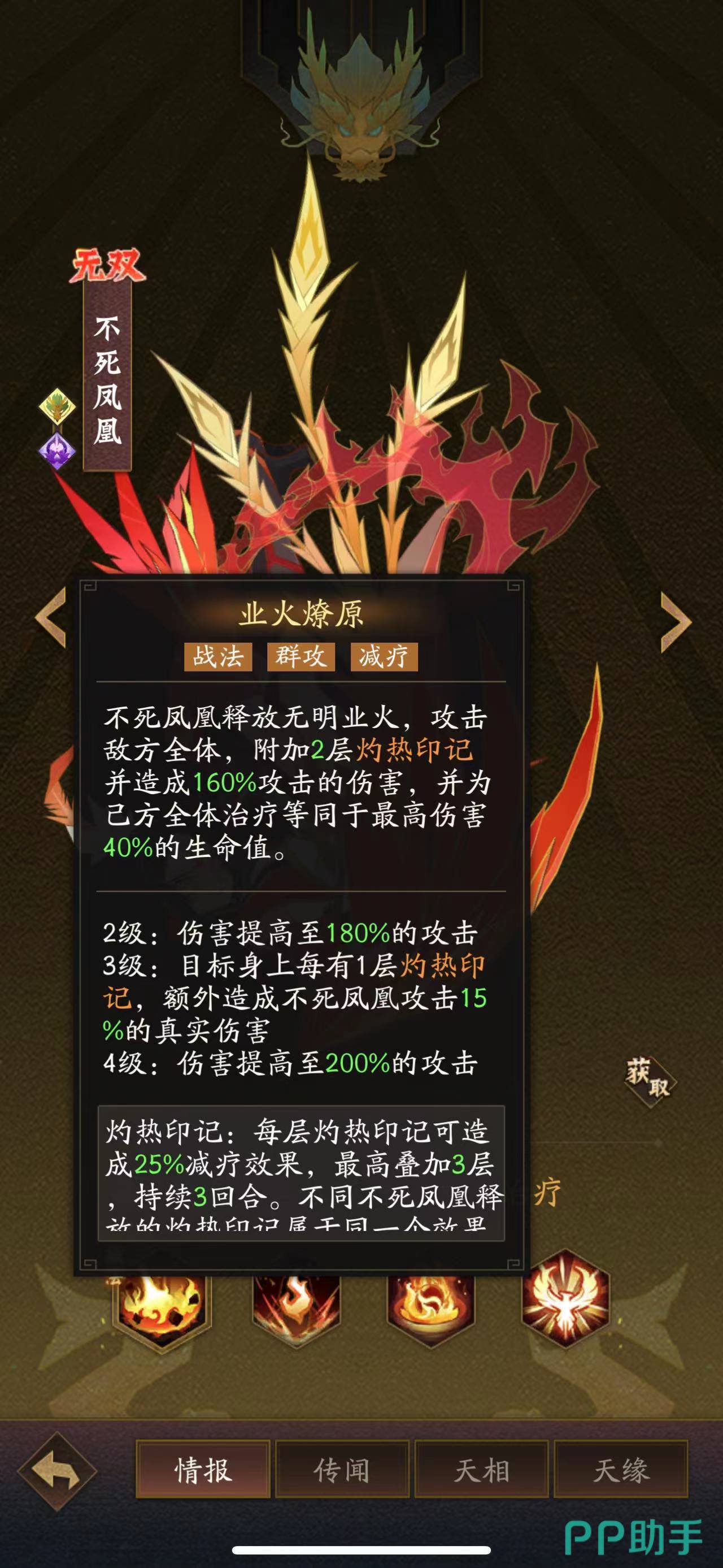 第二个角色是不死凤凰。技能业火燎原属于一个群攻减疗角色,不死凤凰释放无明业火,攻击敌方全体,附加2层灼热印记并造成160%攻击的伤害,并为友方全体治疗40%的生命值。这个角色的技能随着等级的提升来改变伤害。