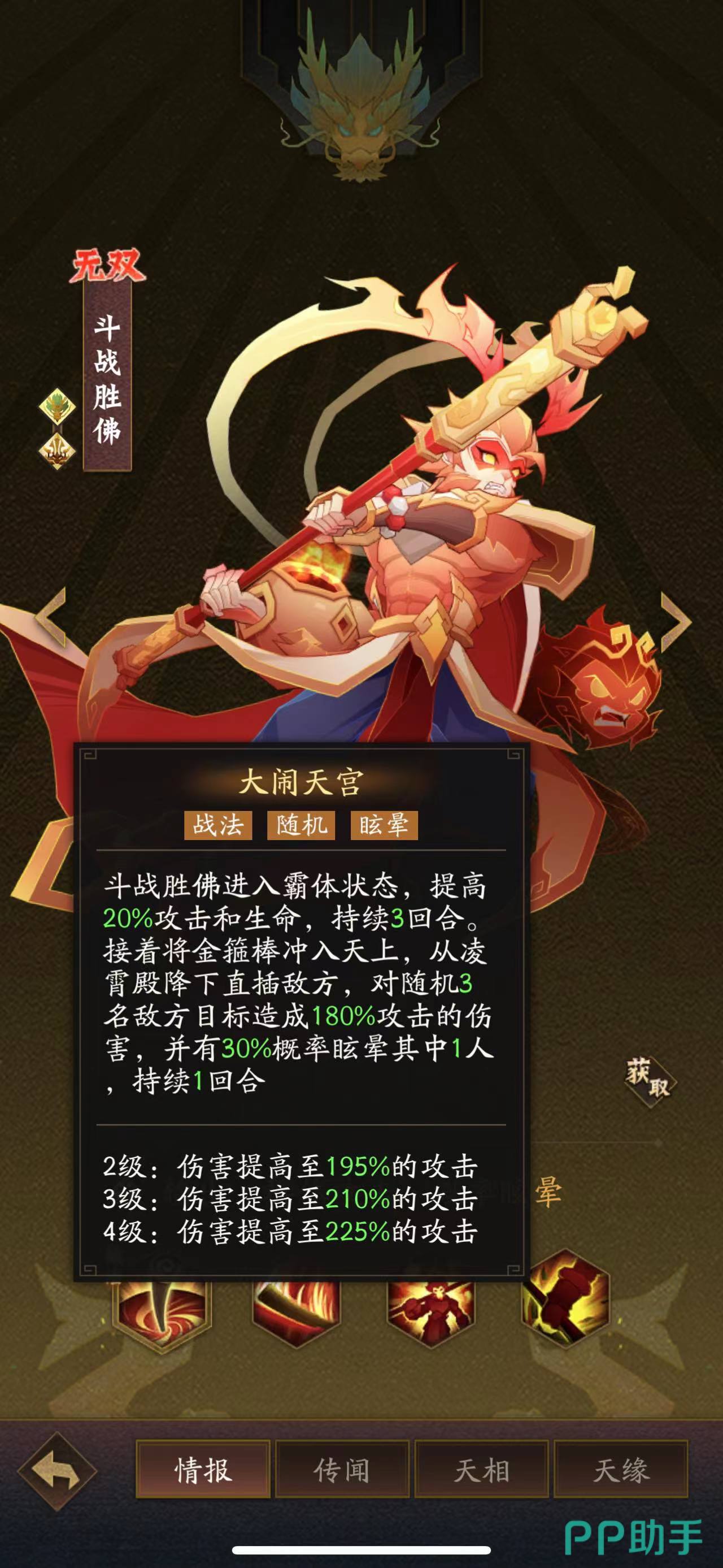 这个游戏的卡牌分为三个等级,分别是无双,极品,卓越,而无双是等级最高的红色卡牌,无双中的角色一共有3个,其中斗战神佛,玩家们在登录第一天就会赠送,这个角色的技能大闹天空也是非常的厉害,角色会进入霸体状态,提高20%的攻击力和生命值,持续3回合。接着将金箍棒冲入天上,从凌雪殿降下直插敌方,对随机3名敌方目标造成180%攻击的伤害,并有30%概率眩晕其中1人持续1回合。