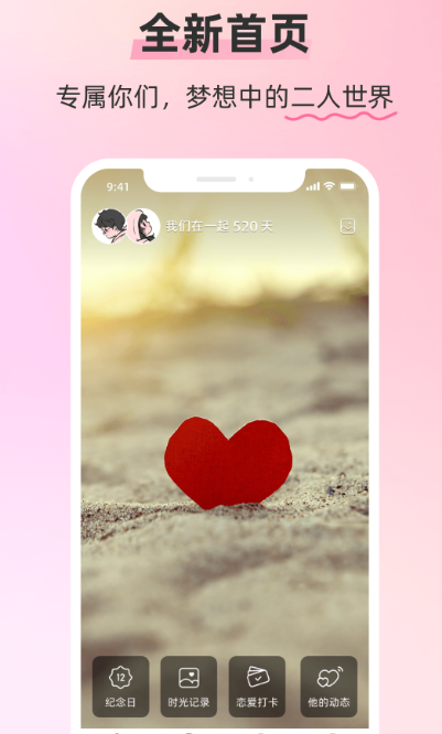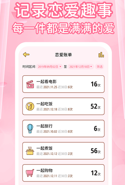 通过这款软件来记录两个人日常恋爱的甜蜜事情,是非常不错的,深受很多情侣的喜爱,目前使用这款软件的用户高达上千万人,不仅可以记录一些甜蜜的瞬间,同时还可以在上面进行互动,为情侣打造私密空间,深受情侣的喜爱,这款软件上还提供了很多不错的功能,比如一起看电影,即使是两个人相隔千里,也可以一起看一部电影,里面还有恋人清单等等。记录两个人一起完成有趣的事情。