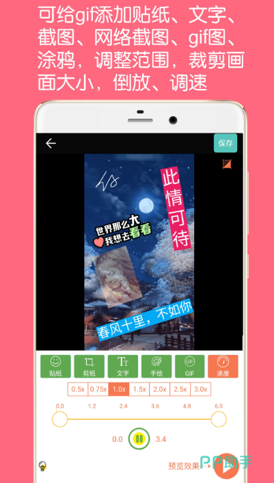 这款软件的功能是非常全的,不仅适用于视频转gif,还可以编辑一些原有的gif动图,以及录像等等,在过制作的过程中可以根据自己的喜好添加喜欢的文字和图片,按照自己的风格随心所欲的来进行设置。并且在这款软件上制作出来的表情,还可以一键分享到朋友圈。