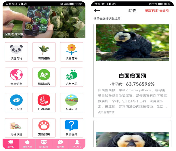 它的使用方法很简单,只要通过拍照,就可以识别出这些动物和植物的种类和名称,如果手中有不熟悉的东西,或者不知道来源,就可以用它来帮忙,不但会进行准确的匹配,还会为你提供各种相关的介绍,让你了解到每一件物品背后的故事。