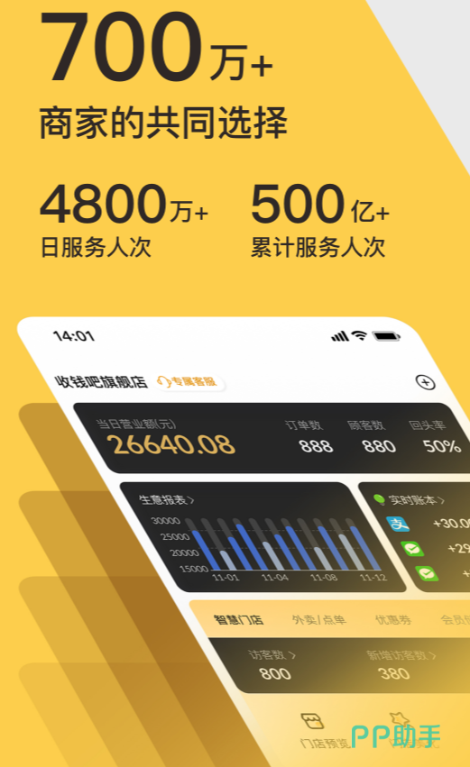 收钱吧app是七百万商家的共同选择,这是收银员,外卖员,全能生意上的小帮手,一站式满足用户的所有需求,同时可拥有属于自己的的外卖,点击小程序进行支付,多种功能帮助用户增加销售金额,支持各种支付方式,一秒到账。