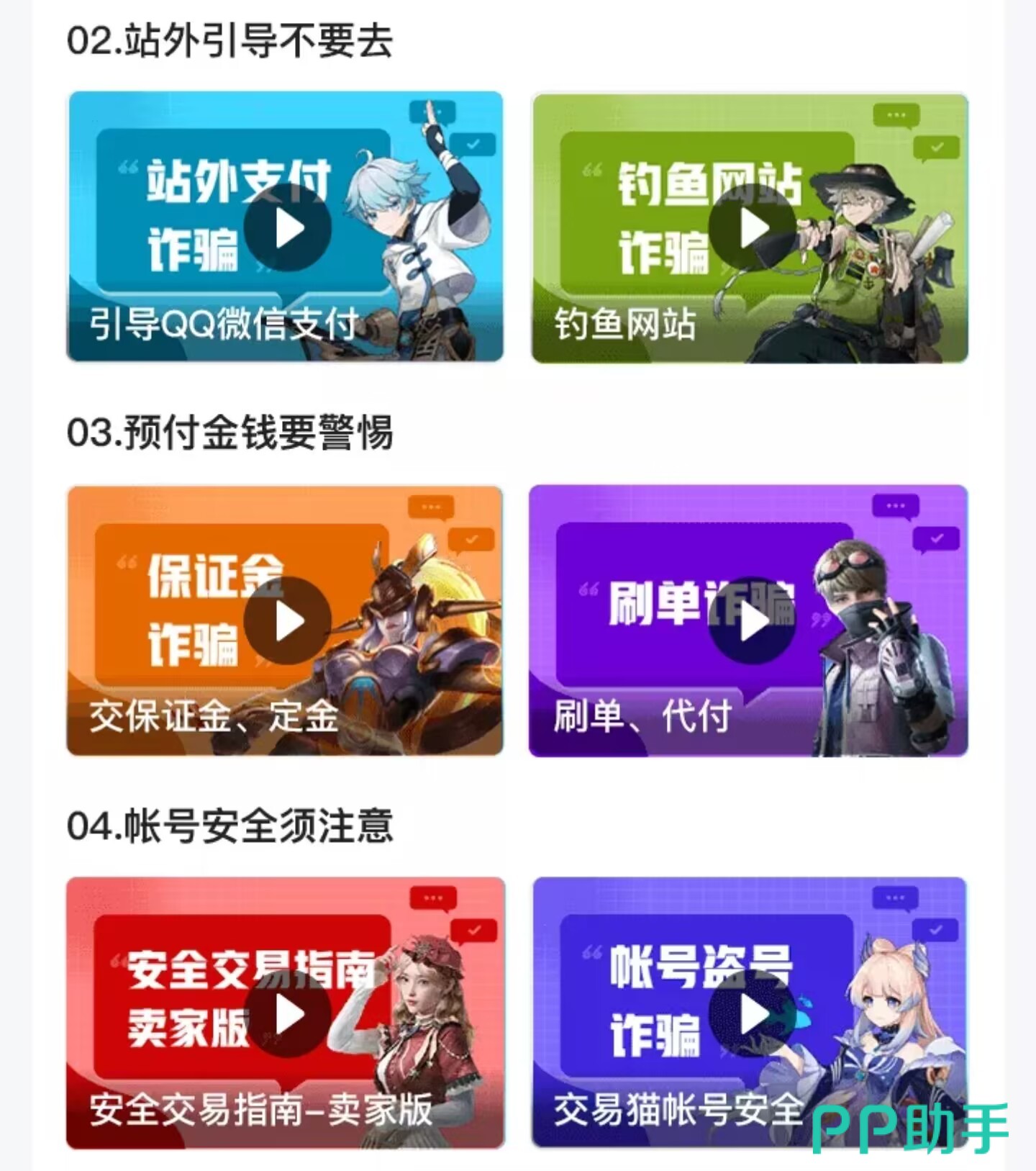 小编上面提到的这两个途径,第一个途径可以说安全性是有很大问题的,所以在保障安全性的方面,交易猫做的非常好。首先,从最基础的方面,它提供了安全学堂,可以在上面学到一些防骗知识,这些知识虽然看起来不多,但是已经完全可以应对,平时在平台中的交易安全需求,通过学习这些可以大大提高我们的防范性,从而避免被一些不良买家骗取账号。