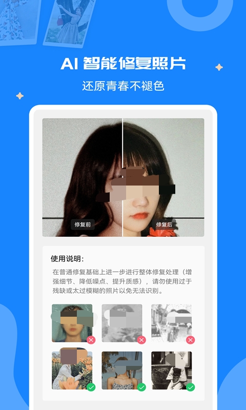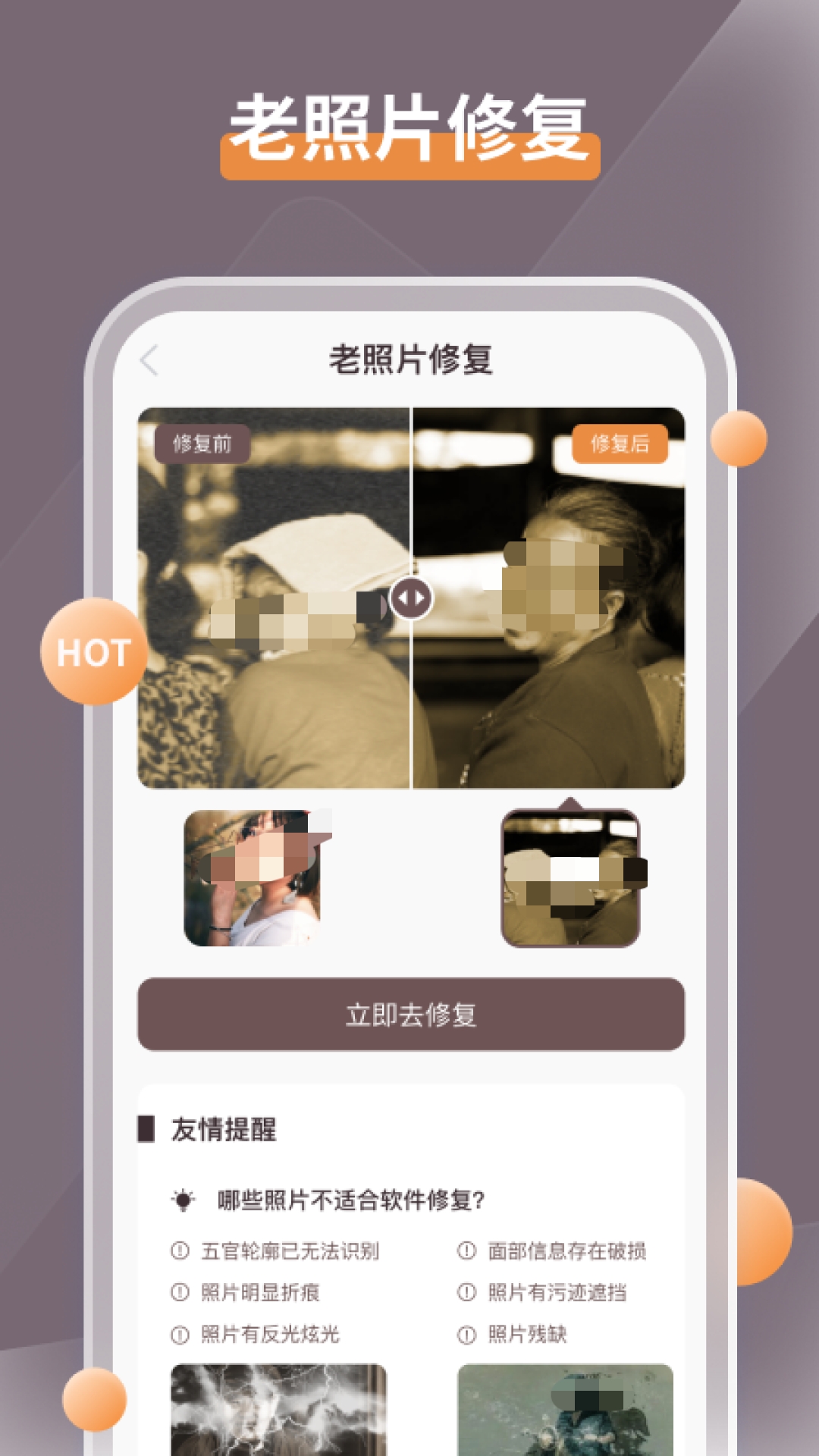 智能修复老照片这款软件可以让我们实现30秒钟老照片快速修复,其高效的修复效率受到了很多用户们的强烈推荐。但是借助这款软件并不是说每一种照片都是可以修复完成的,因为如果照片破损程度过高或者照片污渍严重遮挡人像的话,我们也是很难实现照片的高清修复的。