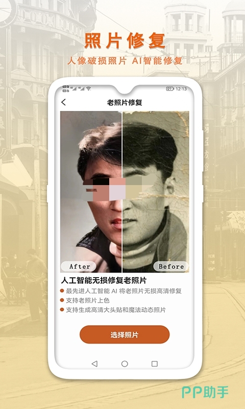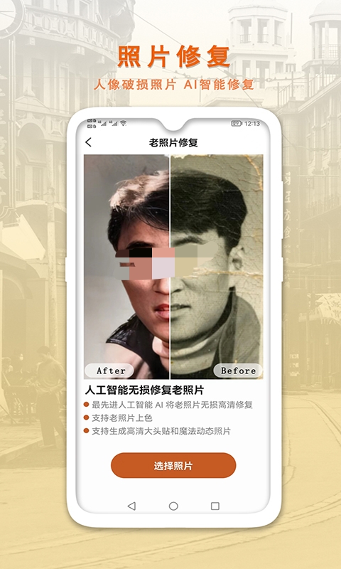 修复老照片这款软件可以让老旧照片重新回到高清的感受。在这个软件上,我们能够体验智能AI图片修复,可以修复我们老旧照片上残缺的部分,让照片恢复原来的相貌。同时如果自己的老旧照片是黑白照片的话,软件也会根据系统的分析以及上万张照片的学习经验,为我们智能补色。