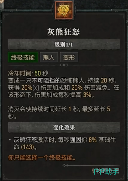 最后就是终极技能里的“灰熊狂怒”,这个也是变身系的技能,不过相比前面那些技能,它会显得更加重要,因为可以直接让玩家的变身持续足足二十秒,这二十秒内你除了样子变成熊人以外,包括伤害和免伤这两个方面也会得到增强,而且随着时间的增长,这个增强的幅度也会进一步提升,另外如果你把它的分支也给点出来,那么还可以获得额外的基础生命墙固效果。