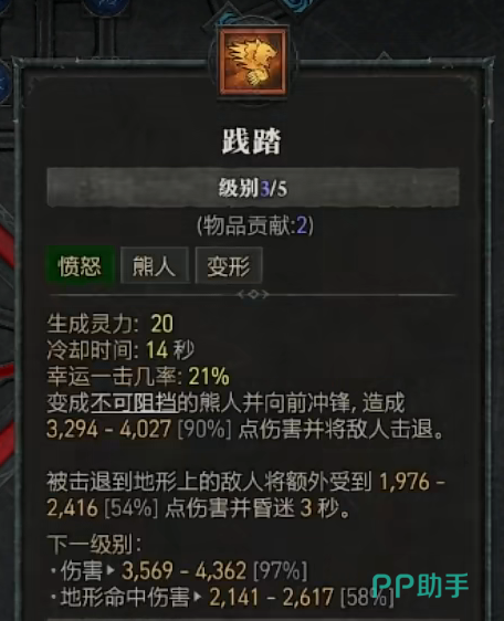 然后在愤怒技能中需要把“践踏”给加三点,它只需要消耗二十点灵力,但却可以让你化身熊人进行一次不可阻挡的冲锋,这个冲锋过程是真正意义上的免疫控制,在被小怪围殴的时候,利用这招很容易就能破局,另外该技能的基础伤害就已经破千,而且能吃到90%的加成,所以也有着不俗的清怪能力,另外它还可以对撞到的敌人施加长达三秒的昏迷效果,当做团控也十分给力。