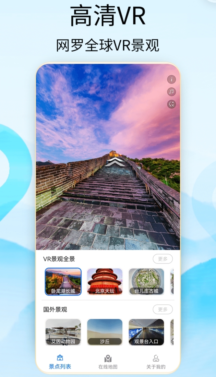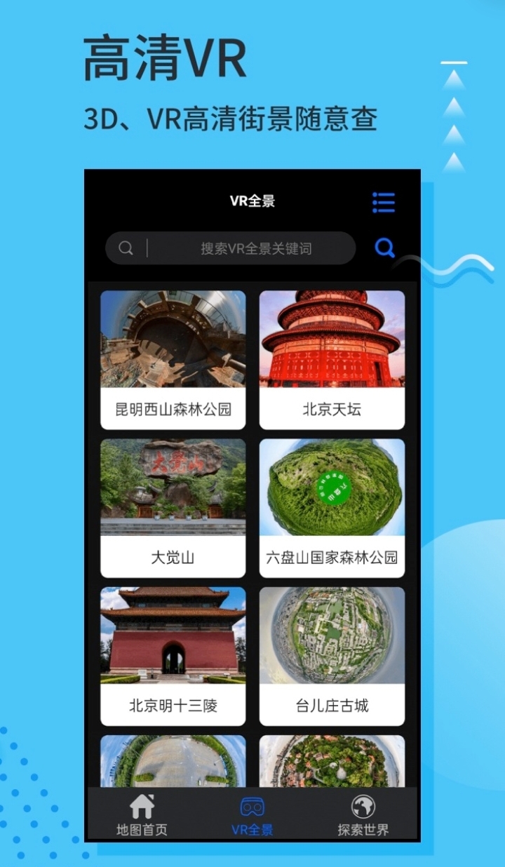 能让你足不出户就可以看遍全球的app,有3D视角和VR观全景,知名景点一搜即可观看,名胜古迹一览无余,就连国外景观也可以看,带你了解各个地方的风土人情,还有景点直播和卫星探测。