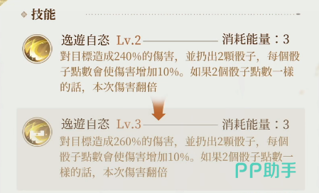 杨修每次释放技能时都会扔两个骰子,根据骰子显示的数字会对自身技能产生额外加成。简单来说,杨修的技能会对目标敌人造成170%自身攻击力的伤害,扔出的骰子点数会让伤害增加10%,如果骰子数字相同的话,会直接让伤害翻倍。如果扔出两个6,那么杨修就可以打出爆炸伤害;但如果扔出的是1或者2····没关系,下次放技能之前记得洗把脸就好。
