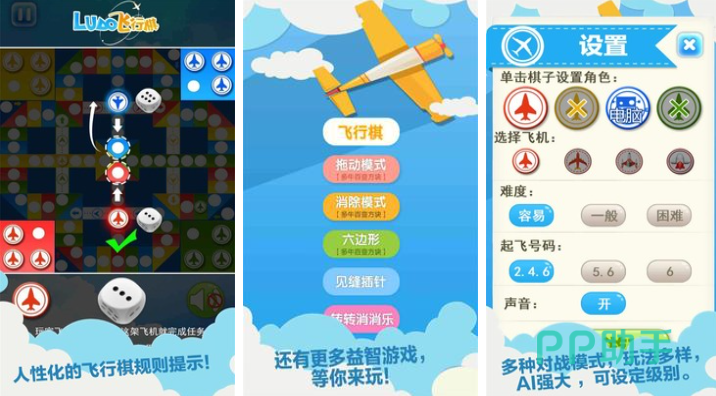 飞行棋也是小朋友非常爱玩的对弈类游戏,投掷骰子的玩法十分考验玩家的运气,棋子前进的步数都是有骰子来决定的,这样充满随机性的棋类游戏备受孩子们喜欢。本作中还有非常丰富的游戏形式哦,比如消除模式、六边形棋盘模式等等,很多喜欢棋类游戏的小朋友对飞行棋赞美不已,本作中的人机对战模式还能自选难度。