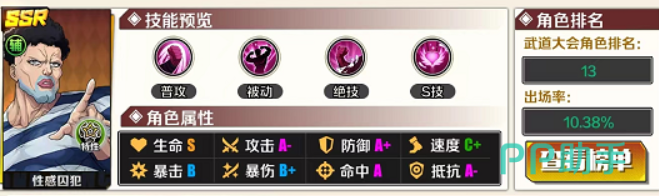 本期,小编为大家带来一拳超人世界性感囚犯技能介绍。在游戏中,性感囚犯作为一个辅助角色,各项能力非常平衡,只是在速度上稍有不足。他的被动技能能够配合我方单个英雄进行全体追击,伤害输出表现优秀。他的大招则具备强大的群体恢复能力,可以为队友提供充足的生命恢复。接下来,让我们深入了解性感囚犯的技能效果。