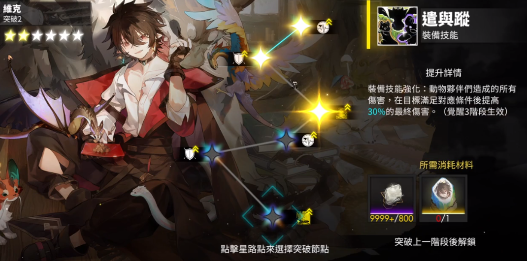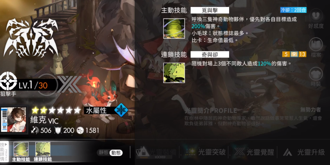 连锁技能上面的话是可以连接水属性格子的,带来的也是水属性伤害,在觉醒之前带来的伤害百分比是140%,如果觉醒之后还可以让召唤来的三个动物继续攻击,清除其他的一些小怪,后期的装备技能会将维克的一个普攻变成召唤技能,所以如果大家想用维克带来更高输出的话,它的输出基本是靠召唤来的几个小动物哦。