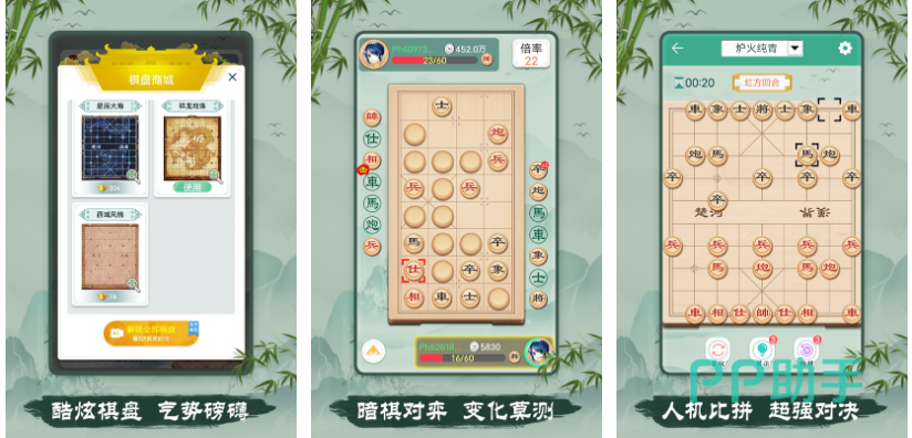 这是一款界面十分简洁的象棋类型手游,游戏的独特之处在于你可以更改棋盘的外观,让你的棋盘显得个性十足。这款棋类游戏的玩法与真实的象棋一般无异,简单明了的游戏规则让游戏难度大大降低。很多新手玩家都喜欢玩人机比拼模式,在人机模式中你可以无限悔棋,直到击败人机对手为止。