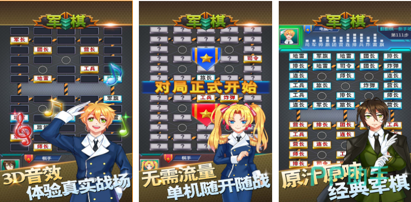这是款支持单人挑战和联机对战的军棋类游戏,原汁原味的军棋棋盘和经典玩法让军事迷爱不释手,真实立体的音效也让玩家体验到了逼真的战场。游戏中的单机模式可以自选AI人机的难度,在无聊的时候就可以跟AI人机来一场对练,在线匹配的模式更加好玩,你可以跟其他军棋爱好者比拼策略头脑。