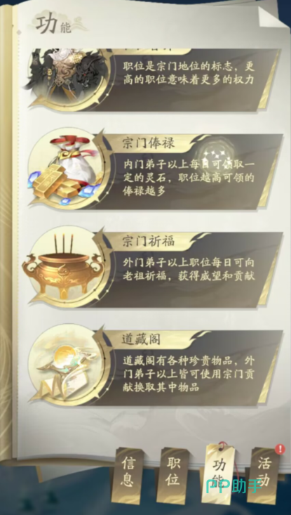 宗门任务方面,游戏中大家进入宗门后会看到一个贡献度和声望,这些每天都需要做宗门任务才能提升,具体的宗门任务有宗门起伏、宗门悬赏,大家每天务必做完,尤其是宗门悬赏,大家在做悬赏的时候一定要做最高阶的悬赏,不要怕浪费灵石要多去刷新,因为悬赏每天是限次数的,只有最高阶的给的才多,所以大家要做最高的,之后当声望和贡献度累计到一定程度时就会开启宗门商店,商店中的物品都是顶级的法宝和功法,这些换完后是能提升很多属性的。