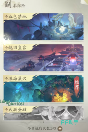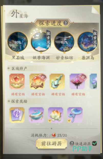 除了难度方面,副本还有挑战奖励,这个奖励是和时间挂钩的,这里建议大家开启最高难度后直接世界频道上找大佬带,先把挑战奖励拿了,拿完之后每天随便组人打满三次就行。之后是游历和宗门任务,游历方面大家剧情只要做到一定程度后就会开启一个游历玩法,这个游历玩法就相当于野外探索玩法,这个玩法是分区域进行的,不同区域有不同的奖励,大家每天一定要记得给游历拉满,因为不管是哪一片区域的游历的奖励对玩家的属性提升都是非常大的。