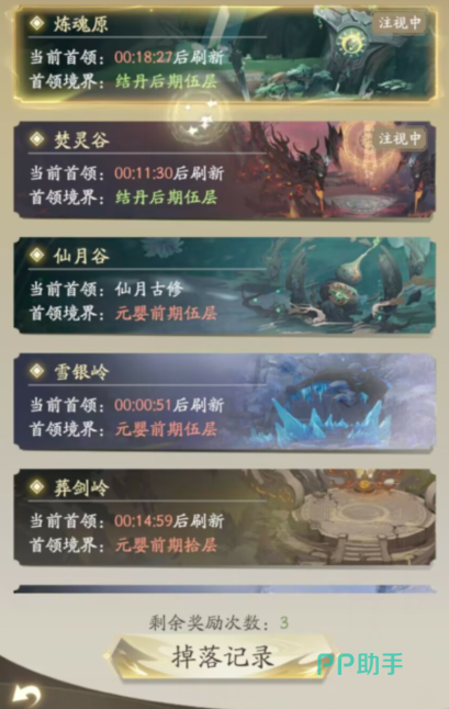 之后是副本boss,副本boss的主要掉落是修为和药材材料,另外有概率掉落法宝,不过这个概率可以忽略。副本方面大家首先要做的是以最快速度开启当前境界等级的最高难度副本,因为这个副本的奖励数量是和难度挂钩的,所以大家一定要打最高难度。
