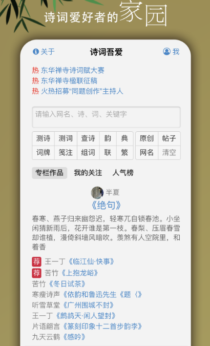 通过这款软件可以很好的提高学生学习诗歌的能力,而且在进行诗词格律检测的时候,只需要输入诗或者词,点击开始检测。可以很好的检查检测出何处出律、何处不押韵等等。在软件上还可以发表自己的观点,进行评论、点赞、分享等等,让更多的人了解到这些诗词的魅力。