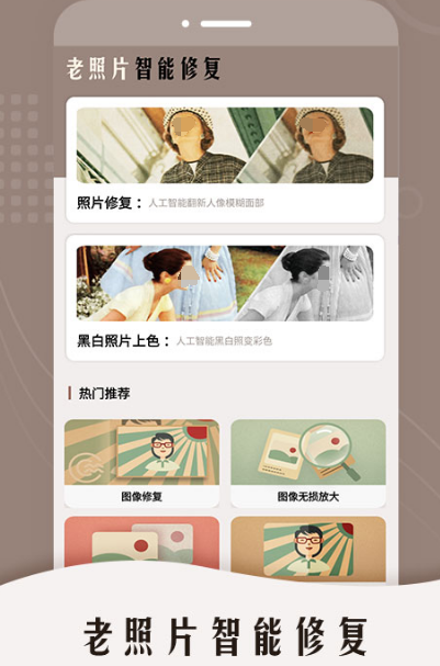 现在人们对照片修复的需求越来越大,有的是因为误删照片需要再次恢复,有的是因为照片模糊不清,想要修复。如果想要修复模糊不清的照片,可以下载老照片智能修复,该软件其中融入AI图像生成技术。很多非常珍贵的照片值得怀念,但由于时间过久早已经变得模糊,或者曾经照相机像素不高照片模糊及褪色等,都可利用老照片智能修复这一个软件来改善,让照片得以修复,让黑白照片变得更加鲜活。