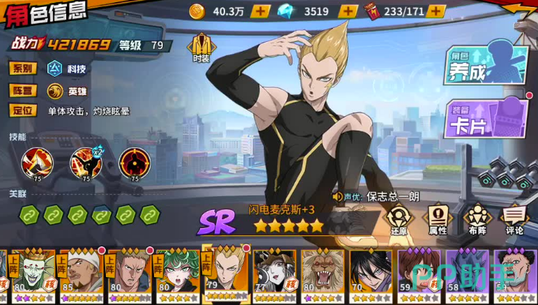 埼玉,是游戏中最具有代表性的一个角色。他是一个非常直爽的光头男,战斗时拥有很强悍的战斗力,使用的都是一些操作简单实力强悍的技能。但面对boss的时候,能够发挥出强大的实力,很适合新手。
