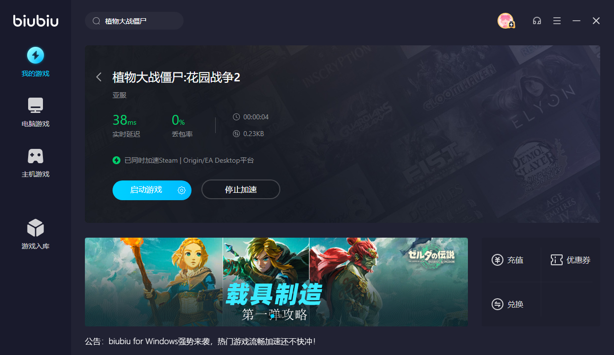 第三步,智能加速模式。同手机端biubiu设定方式不同,一键开启即可。用户在主页搜索游戏名称,找到对应的花园战争2版本,开启所在服务器的加速,biubiu在此提供欧服、亚服、澳服、北美服的加速。接下来,大家打开加速,运行游戏即可。