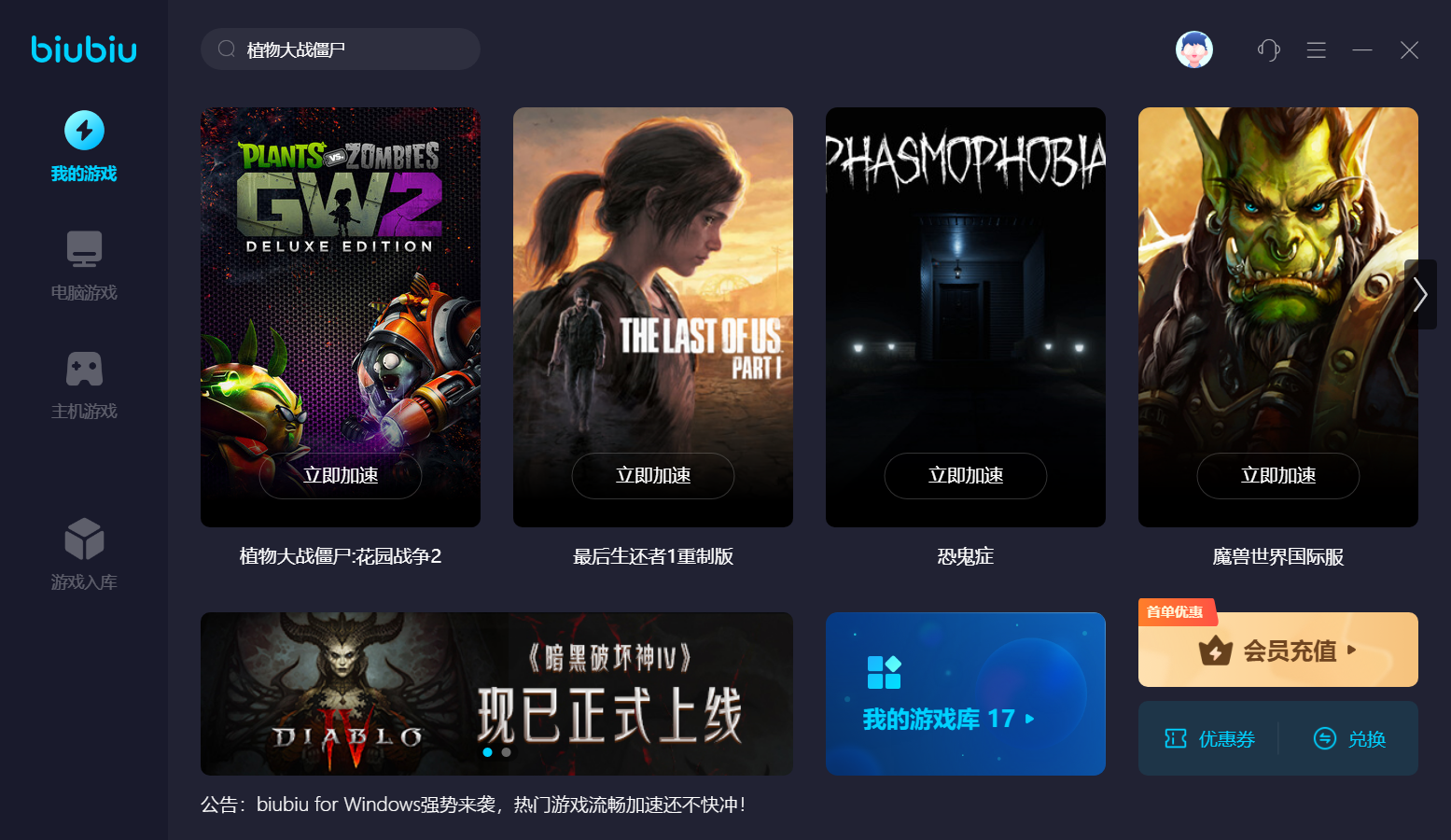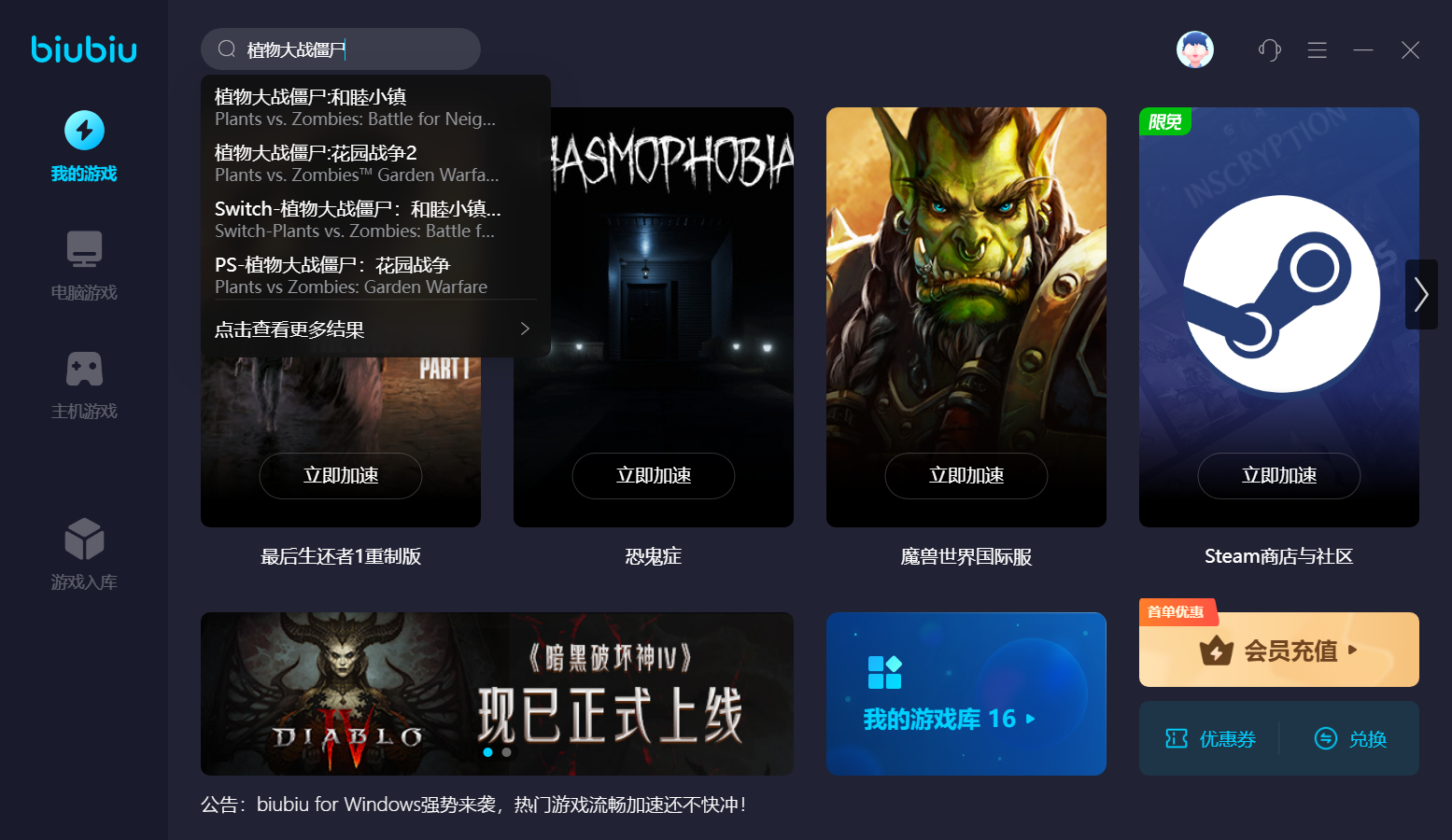 biubiu最大优势就是更新频率高,同各款游戏实时同频更新,通过最新节点和优化技术,实现高效率提速,带来最优处理结果。而且,第一次注册用户直接获得24小时免费福利。