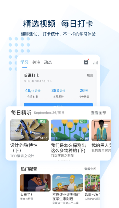流利说英语是一款注重口语能力培养的英语学习平台,它通过在线课程和口语练习等功能来帮助用户提升英语口语表达能力。流利说英语的学习英语功能主要集中在口语模块,它提供了大量的听力材料和口语练习任务。用户可以通过听力材料来提高听力理解和模仿能力,然后通过完成口语练习任务来锻炼口语表达能力。流利说英语注重与真实场景的接轨,通过模拟对话和交流来提高实际应用能力。流利说英语也提供了英语听写和纠错功能,以及语音评测来辅助用户改进发音和语调。