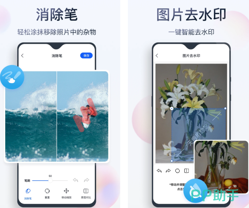 这款实用的图片编辑工具有较为强大的消除笔功能,可以对着物体、人像以及背景进行编辑消除,调节清除笔尺寸大小,哪里不要就点哪里,能够轻松清除杂物无残留。还支持纵向和横向自由搭配拼图模式,无论是套模板还是DIY都可以,让你简单做出多人相册效果。