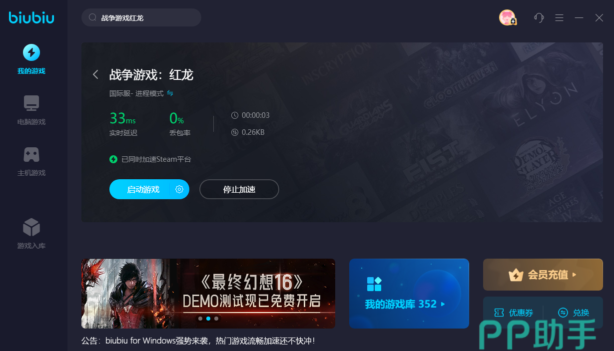 目前这款工具推出了新注册用户专享的24小时免费试用福利,大家可以点击上方的按钮来下载领取。软件的使用操作极其简单,想要加速某一款游戏直接在其中搜索就可以了。Biubiu开设了电脑游戏以及主机游戏两个大专区板块,主机游戏中有很多都是限免使用优化服务的,非常良心。而且支持的游戏阵容很多,战争游戏红龙算是一款比较小众的作品了,很少有平台会支持,大家就可以使用biubiu来进行加速。