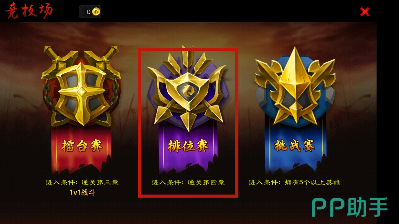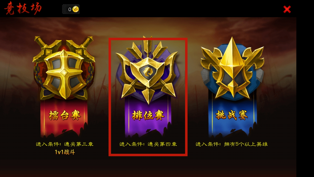 如上图所示,点开后,我们能看到从左往右依次为擂台赛、排位赛和挑战赛。其中排位赛需要玩家通关主线副本的前四章才能进入。