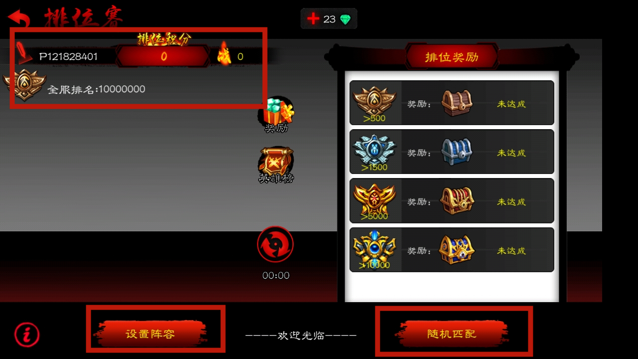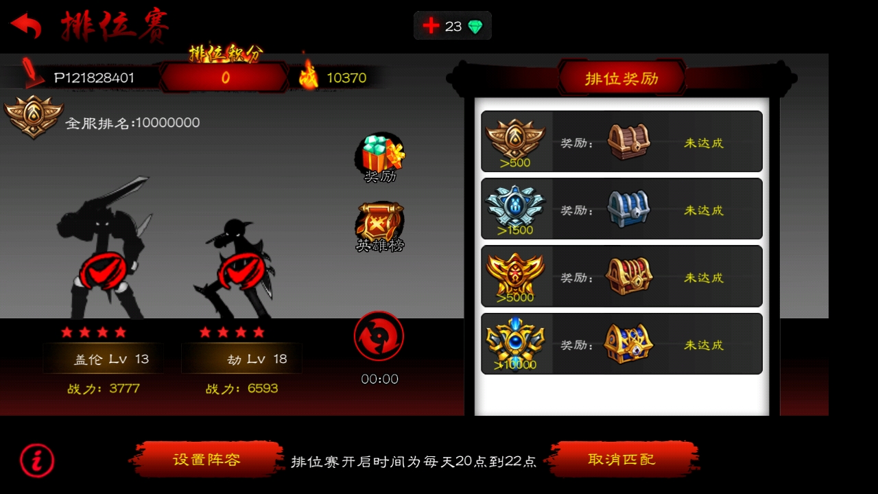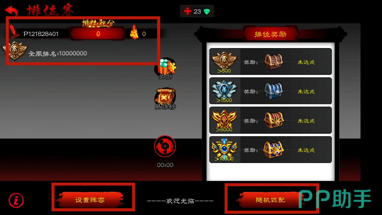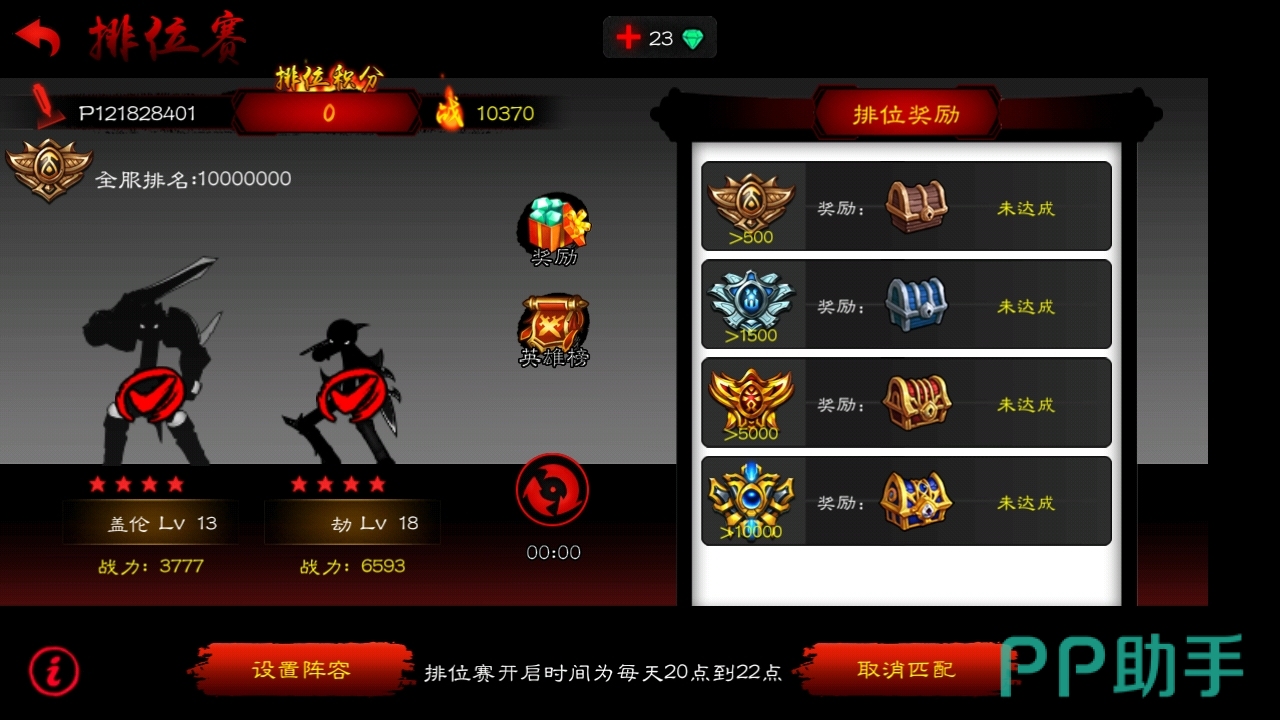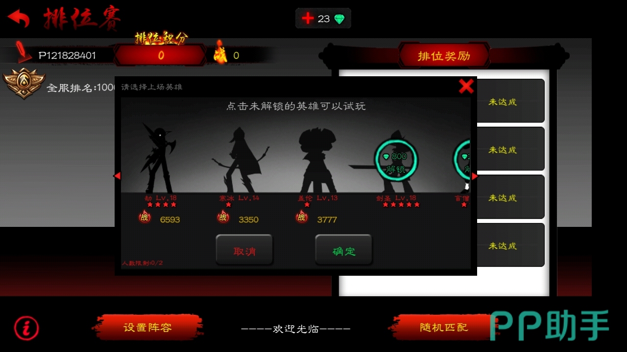 进入排位赛,如上图所示为其主界面。其中左上角能看到玩家当前的全服排名和当前排位积分情况(第一次进入时为默认排名;另外部分玩家会由于手机网络问题而无法显示名次等信息)。在右方能看到可以获得的奖励。对平民来说,获得1000左右积分还是很容易的。而最下方左面可以设置出战的阵容。如上图二所示,我们能在人物界面选择出战的英雄,排位赛共可以出场两位英雄。
