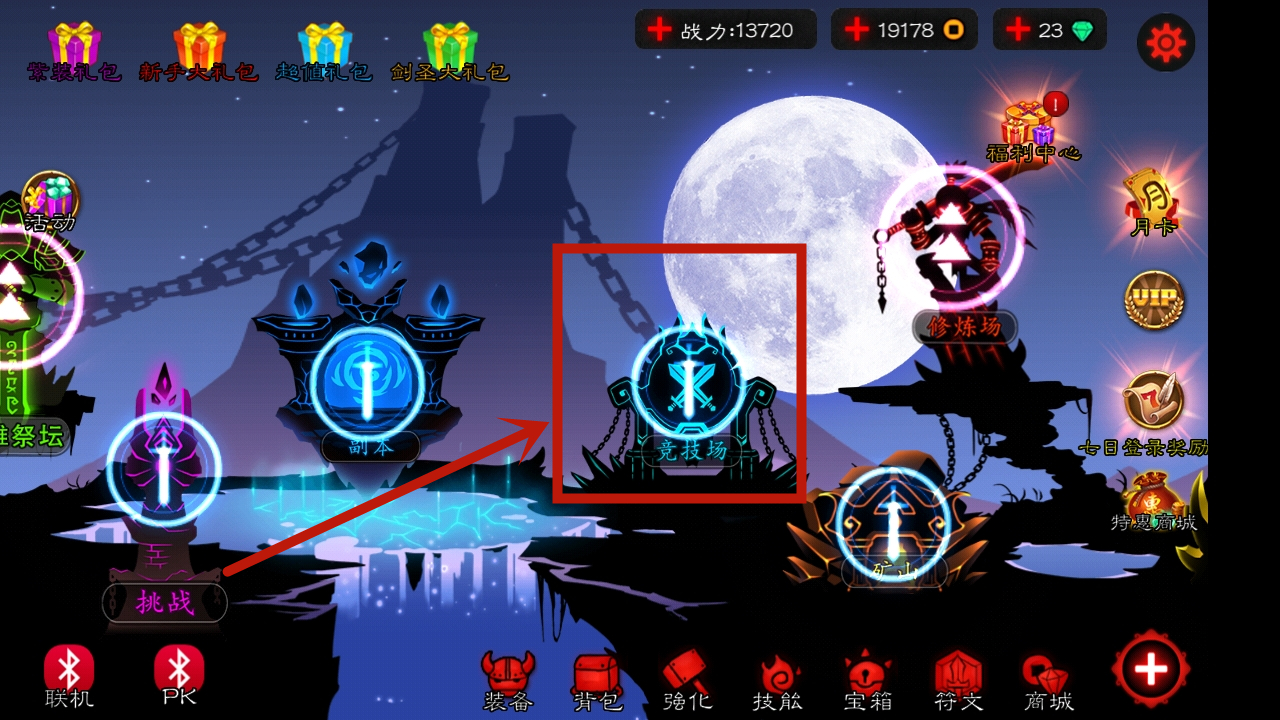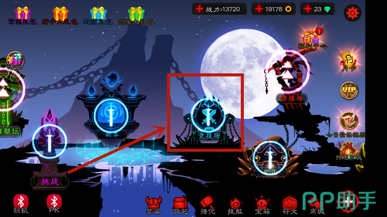 如上图所示,在游戏主界面中,我们能在右侧看到竞技场的选项。在这里即可进行排位赛及其他PK类玩法。