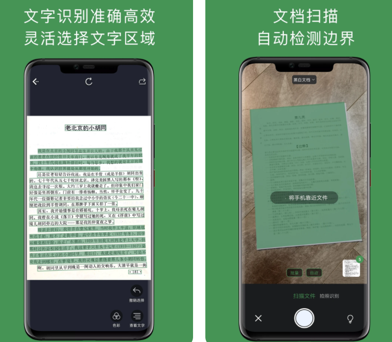 支持手机摄像头在线扫描平面,能调整分辨率,也支持一键选择本地图册多图识别合并成一个文档,上传图片大小不一样也可识别,自动排版合成美观。软件内有文档管理,扫描结果自动存入本地,用户可自行分类储存,以备不时之需。