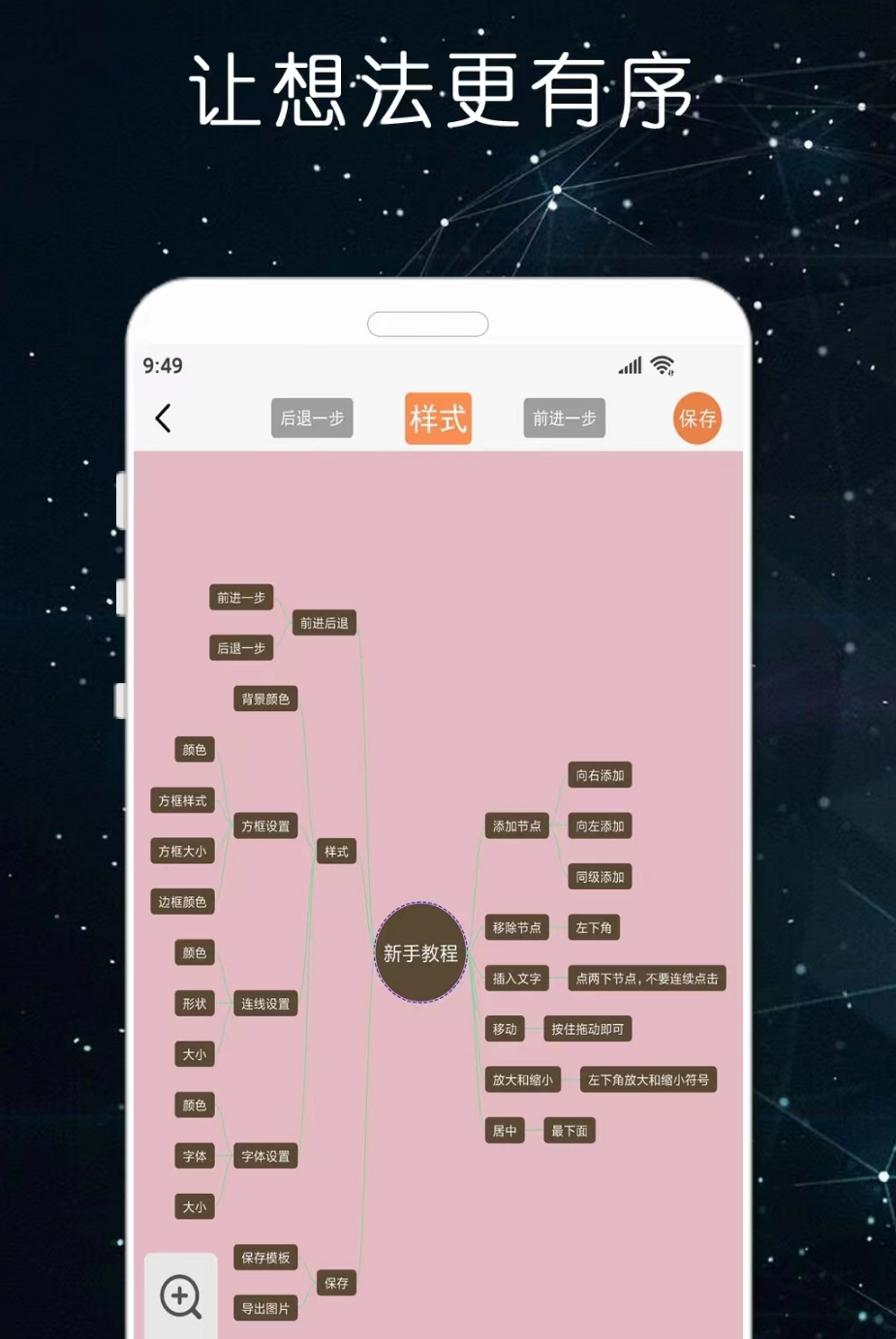可选择固定模板式思维导图,也可选择全程手绘,将自己的思路整理成为清晰的框架,在处理工作时打开手机按照这份脑图去做即可,能够让你的生活和工作都变得特别高效,多种适应主题颜色融入,让界面变得更加清新耐看,数据都能直接保存在app或者是生成图片保存到本地,后续在使用和打开、修改时都更加快捷。