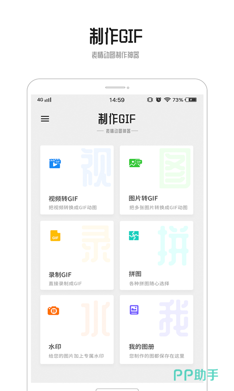 一款能将静止的图片变成动图的app应用,一款能为图片注入活力的app。用户能导入图片然后将其进行转换,也可录制视频然后转成gif,两种转换方式皆可,大家任选其一即可。