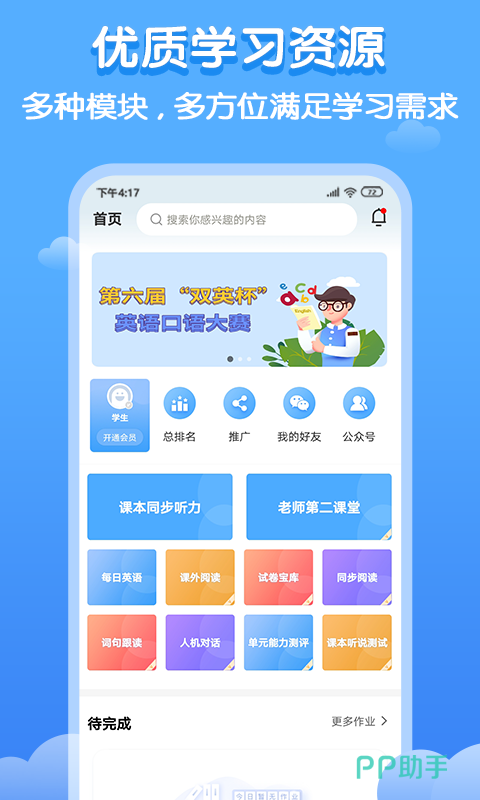 双英口语这款软件应用是一款专门致力于提高听说领域的英语练习软件,在这款软件上能够同步练习课本的内容,让我们一方面练习了英语口语的发音,另一方面也实现了文章内容的温习。同时在这款软件上大家还能进行语句的跟读,这种形式可以让我们了解某个语句的标准发音形式,这样能够让我们的学习针对性更强。