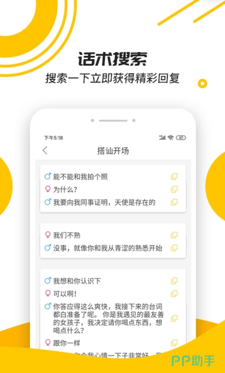 如果你有跟女生聊着尴尬的时候,那么有了这款软件就不用怕了!里面有上百万条聊天话术,教你如何跟女孩子聊天。如果还有不懂的,在问答社区还有恋爱经验丰富的朋友,你可以找他们解答难题。