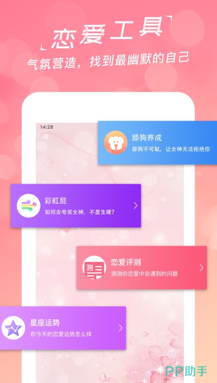 在谈恋爱时,总会避免不了说几句情话让对象开心,这款软件可以说是一个聊天话术库,有许多不同类型的聊天话语,幽默、甜蜜、风趣、搞怪……你想说的话,这里都为你准备了。