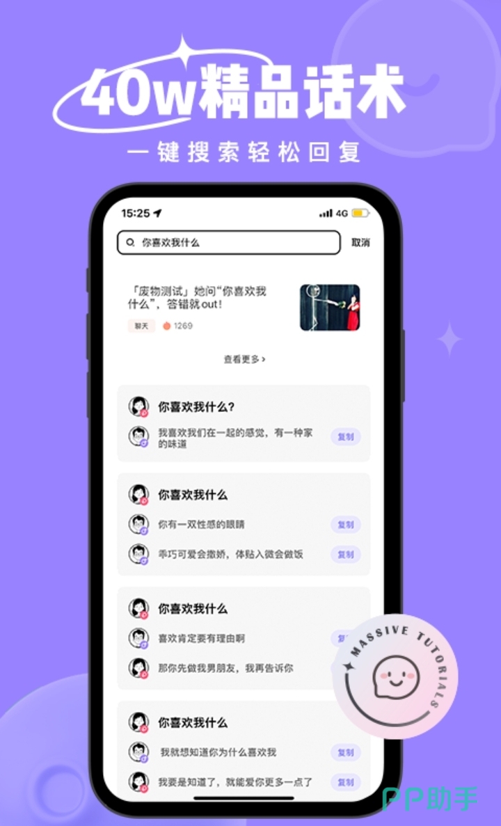 与心仪对象聊天时,如果有答不出来的问题,不知道该怎么回复,那么就可以试试这款app,在里面搜一搜相关的问题,就可以看到许多不同的回复,总有一条是你想发的,有时候让对象开心,就只需要一句话。
