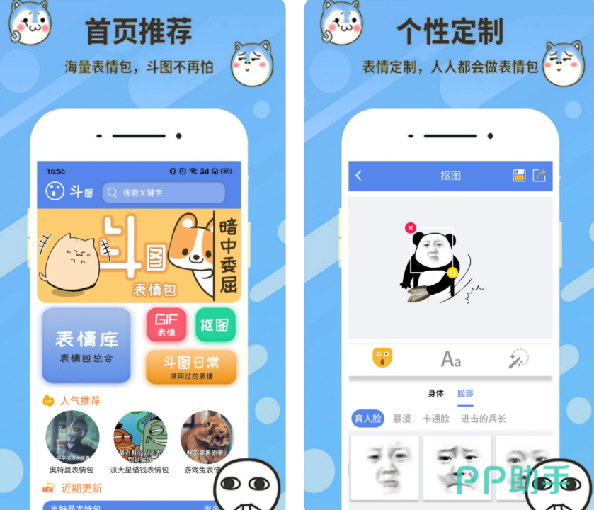 收集当下流行的千款流行表情图,撩妹群聊都在行,经典的熊猫头、搞笑明星剧照、二次元动漫以及萌宠动物应有尽有。先选定好表情模板,上传自己的图片,即可自动生成新的gif图,一键保存到社交平台即可使用。