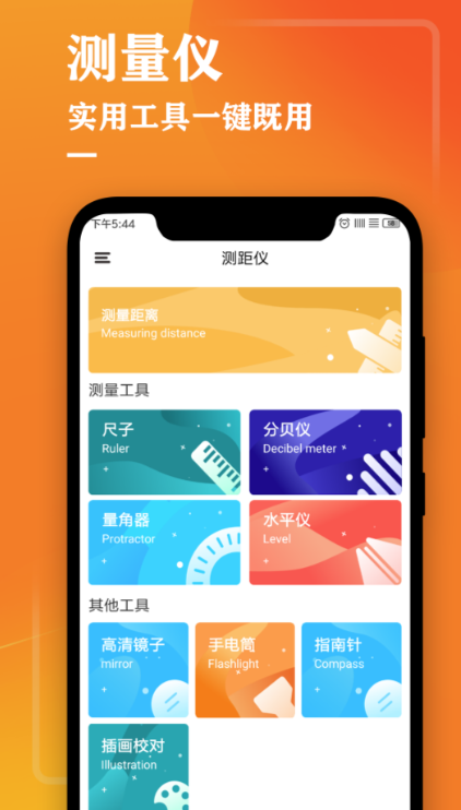 软件中包含着许多日常生活中实用的工具,想要测量面积的使用者可以通过软件内的“尺子”测量出对面物品或者环境的长与宽便能得到其面积。还有其他的使用工具例如水平仪,将手机放置在某一平面上,就能测出该平面是否是水平的,十分精准且方便。