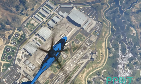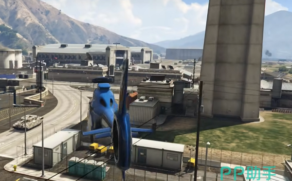 想要看右边飞机场的具体全貌的玩家,可以先乘坐上一辆直升飞机,之后驾驶它来到区域的上空,就可以看到整个飞机场的土地了。这里需要注意的是一定要不要降落在飞机场内部,不然会被里面的坦克等武器直接射击致死。