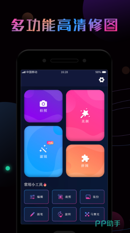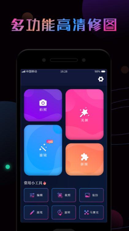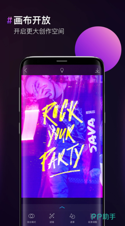 超大的图片处理画布,让大家随心所欲进行图片的编辑和合成,并且软件里有很多有范儿的滤镜和字体,能让大家做出很多炫酷的照片,并且软件还有独特的几何遮挡等功能,调好滤镜,用炫酷功能制霸朋友圈动态吧!