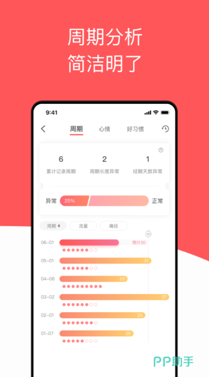 这款软件对大家月经来潮时的自我呵护非常有指导意义,软件不仅会从月经持续时间,规律以及量方面全方位监控,还会帮大家记录每天的心情状况,在痛经的时候给大家温馨的提示和建议,帮助大家度过经期。