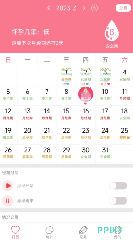 这款软件在帮大家记录大姨妈方面非常用心,会采用各种不同的可爱小图标来对应不同的事项,让大家点开界面就可以一目了然。还有专业的痛经测试,帮大家测试自己的痛经等级,并且根据不同的等级做出最专业的指示。